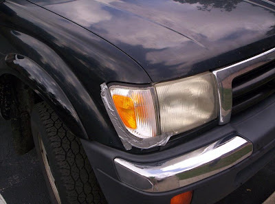 | Since I've driven every inch of I-95 and I-20 in South Carolina, I am confident in saying that the interstates in South Carolina stink! What's more, I-95 is even worse than I-20. The reason I know that the problem is with the state is that you can close your eyes and still be able to tell when you enter the state. (I am not suggesting you do that if you are the one driving!) Part of the reason I-95 is so bad is that it is a major route for trucks going North-South. Since they tend to stay in the right hand lane, there are rather deep ruts in the right lane. Those ruts fill with rain (like on my drive down to Brunswick last Monday) and since the repairs are pitiful if they are even done, you have a constant "ka-THUNK ka-THUNK ka-THUNK" as you drive along. It feels like you have an unruly 10 year old behind you at the movies kicking your chair. Only it lasts for 3 hours. I was in some sort of Krystal induced dreamlike state on the drive down and didn't really notice it, but for reasons you'll soon see, it was very clear on the drive home. I left Brunswick after Jen and I had IHOP. I drove north about 80 miles to Pooler where I stocked up on Krystals. With my cache of steamy goodness in the back, I left Pooler and was in South Carolina in less than 15 minutes. (ka-THUNK ka-THUNK ka-THUNK!) I was zipping along just fine. I passed Florence, SC where I have been coutless times, and started seeing the endless signs for South of the Border, one of the biggest tourist traps on the east coast. (You have to stop there once, everyone does, but once is plenty.) As a side note, I have noticed something. When I was young, the cartoon of "Pedro" on the signs was a big fat jolly hispanic guy. Apparently in the late 80's and 90's someone decided that was "politically incorrect" and Pedro was changed to always have his Sombrero down over his face. (As if an always sleeping Pedro is a better way to represent hispanic people?) Well the new Pedro is apparently wide awake now, slightly fat, but very clearly insane. It's all in the eyes, people. 'nuff said. So as I am thinking about how good old Pedro has gone from a big fat guy, to a slim, narcoleptic, to a middleweight lunatic, I suddely see a problem ahead in the road. The car in front of me hits something that then flies up in the air like a scene from the movie Twister. I'm moving north at interstate speed, and it is moving south, at big scary object speed. My best guess is that is was a metal shower curtain rod, or some long piece of pipe. Either way, it provided a whole different sounding "ka-THUNK" as it smacked off the front of my truck. In hindsight, I am lucky I'm not dead. Had the pole been higher and on the driver's side, I might have gotten skewered. As it was, my dear Tacoma took the hit for me. Obviously I didn't stop to see what hit me. I was in the fast (less ka-thunky) lane and there were cars all over. I made my way to the next exit and pulled off to see the damage. (This is a re-creation of the bloody scene) Once I hit the NC/SC border (under the watchful gaze of Pedro the Psycho) I decided to open my Fanta Grape soda. Which promptly exploded, spewing grape goodness all over my shirt, my lap, the seat, the floorboard, the steering wheel, the dashboard, the roof (you get the idea). The ka-THUNKing had shaken my soda up, and those darn South Carolina road had gotten the last laugh after all. CURSE YOU South Carolina! The duct tape truck repair scene may look familiar. If you'll recall, last September, another auto incident tried to ruin my Cruise. Oddly enough that happened just prior to my first ETB concert in Brunswick. Perhaps it's good that I may not make it to Brunswick for any more ETB concerts. (More on that later!) Since I am new in Wilmington, and thus ripe for the auto repair vultures, I decided to ask around at work if they knew of any good repair men. My new school has an auto repair program and they work on cars. Sadly the last day of the semester was Wednesday, and I don't think this should wait til next semester gets rolling in 2 or 3 weeks. My boss offered to come take a peek at it as we walked over to introduce me to my new Dean. (How's that for an odd trip?) After we inspected the damage it was determined that I could probably fix it myself. I would just need a new light assembly. And with that, my new Dept. Office Administrator (a local Wilmingtonian.. Wilmingtoner.. Wilmingtony.. Wilminger.. whatever) gave me some names and numbers for local places for parts and repairs. Now, $25 later, I am waiting for my new/used front passenger side light assembly to arrive so I can put it in. Or if it's too much for me to handle, I may take it to a repair shop, or perhaps even wait and let one of our school's fine fine students install it for me. What have we learned today? -We've learned that South Carolina roads stink. -We've learned that all that dumb stuff I used to teach in my FOD and Flightline Driving Safety classes also applies on I-95. -We've learned that Pedro's yo-yo dieting has driven him mad. He's also horribly illiterate. -We also learned that you only get to drink half your grape soda in South Carolina, you wear the other half. If it wasn't for the $9.99 20oz steaks just north of Florence, I'd advise everyone to avoid SC completely.  |